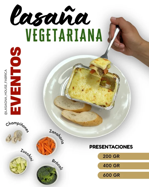 Elaborada con brócoli, zucchini verde, zanahoria y champiñón, integrados en salsa bechamel, capas de pasta y queso gratinado.